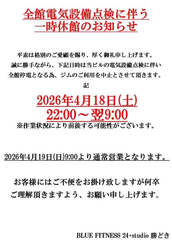 - 【勝どき店】電気設備点検に伴う一時休館のお知らせ