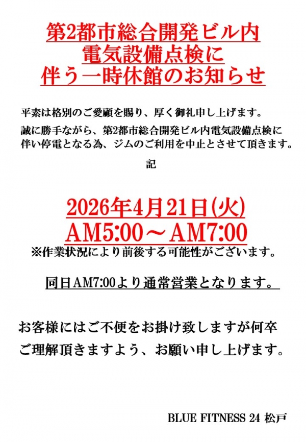 - 【松戸店】電気設備法定点検に伴う一時休館のお知らせ