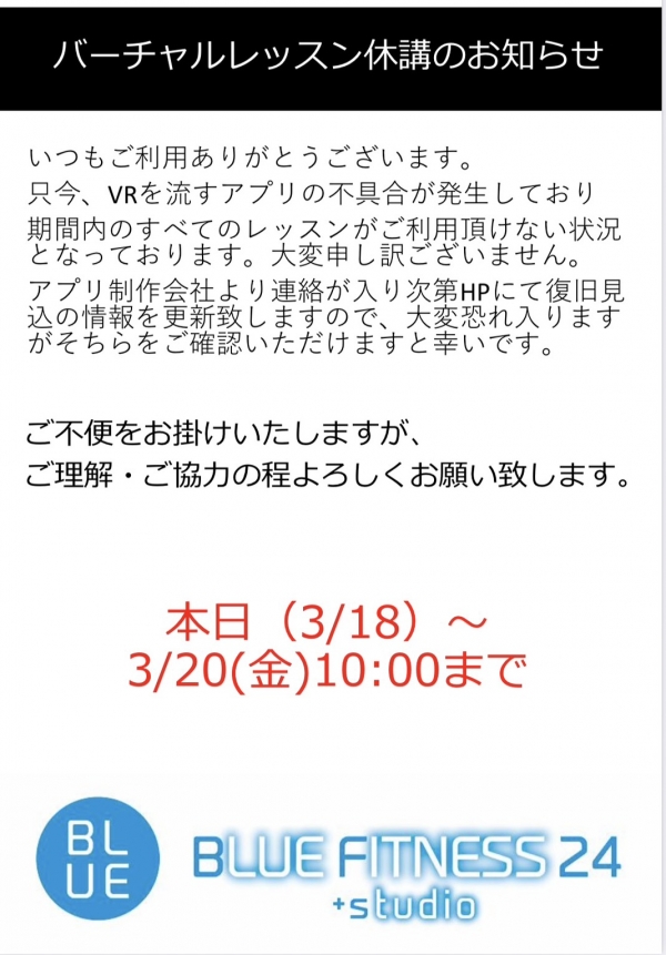 3月18日(水)15時頃より、以下の店舗のバーチャルレッスンを流すアプリに不具合が発生しており、レッスンが出来ない状況となっております。